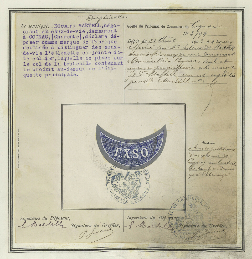 Rectangle central, couleur bleu, inscription 'EXSO', tampon circulaire en bas.
