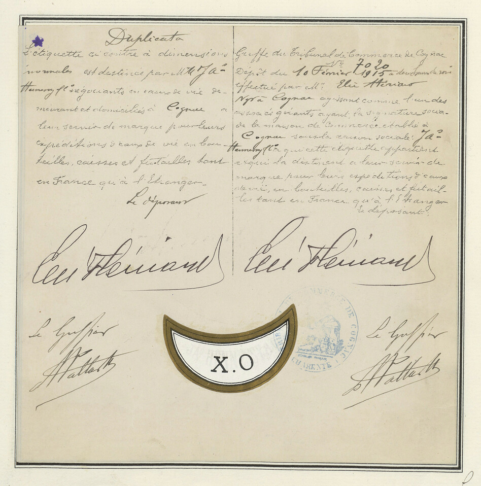Étiquette semi-circulaire, couleurs beige et noir, texte X.O. au centre, fond décoratif.