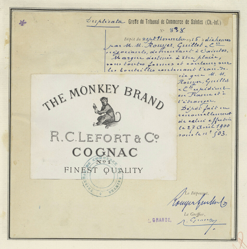 - Étiquette centrale avec un singe, texte noir, fond clair, cadre noir.