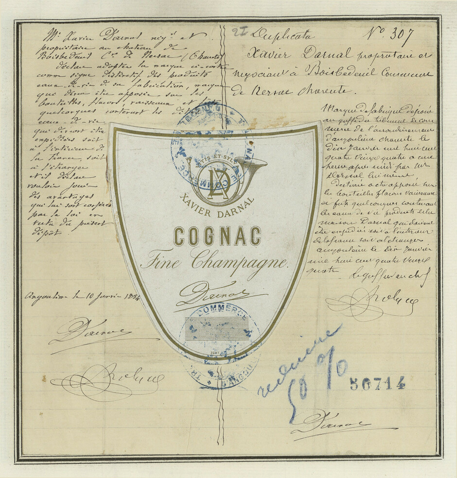 - Étiquette dans un grand cadre, bleu et blanc, avec mention 'Cognac' et logo.